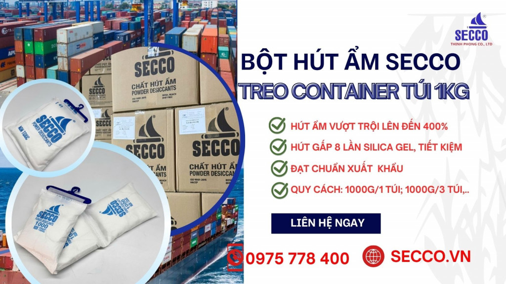 Công ty Cổ Phần Tập đoàn Secco chuyên sản xuất và cung cấp Bột Hút ẩm/ Bột Chống Ẩm Treo container dạng treo 1 Kg với nhiều quy cách: 1 túi, 2 tui, 3 túi, 4 tui, 5 túi,.. tại Việt Nam.