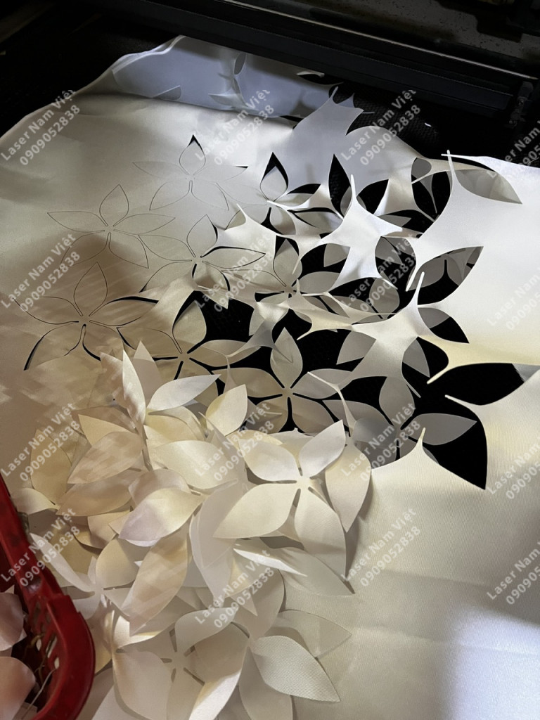 Xưởng Laser Nam Việt chuyên cắt hoa văn – bông hoa trên vải bằng công nghệ laser hiện đại, đảm bảo: