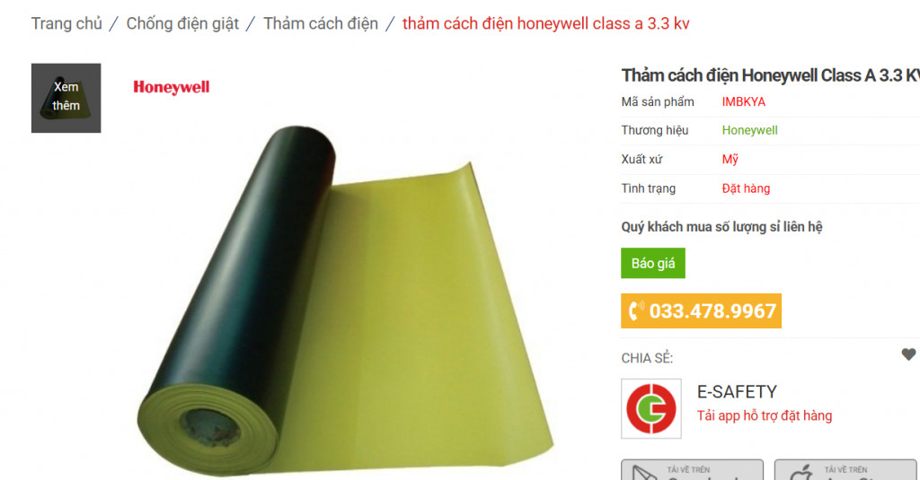 Sản phẩm thảm cách điện hạ thế Honeywell Class A 3.3 Kv được thiết kế và sản xuất để sử dụng bảo vệ người lao động khỏi những ảnh hưởng, tác hại có thể xảy ra khi làm những công việc tiếp xúc với nguồn điện hạ áp.