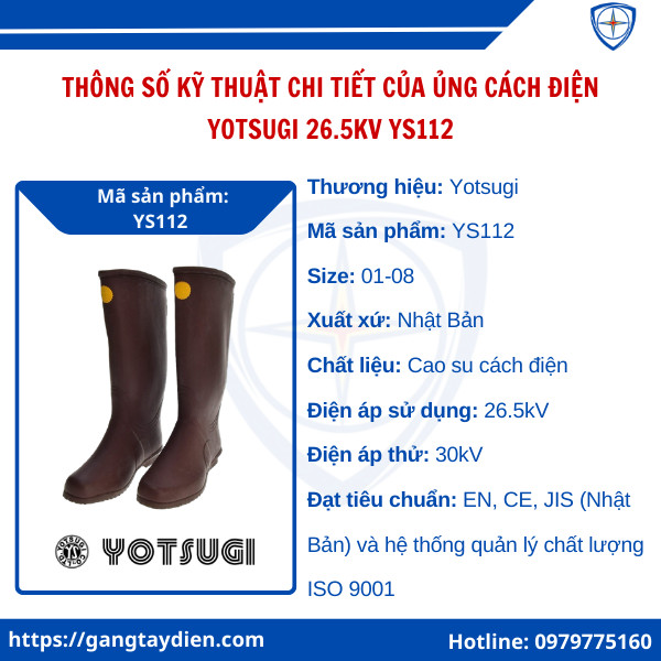 Ủng cách điện Yotsugi 26.5kV YS112 là dòng sản phẩm chuyên dụng đến từ thương hiệu Yotsugi Nhật Bản được thiết kế để bảo vệ người dùng khi làm việc trong môi trường có nguy cơ rò rỉ điện áp cao. Sản phẩm đáp ứng các tiêu chuẩn khắt khe về cách điện, độ bền và khả năng sử dụng lâu dài, phù hợp cho các đơn vị điện lực, nhà máy, trạm biến áp và công trình kỹ thuật điện.