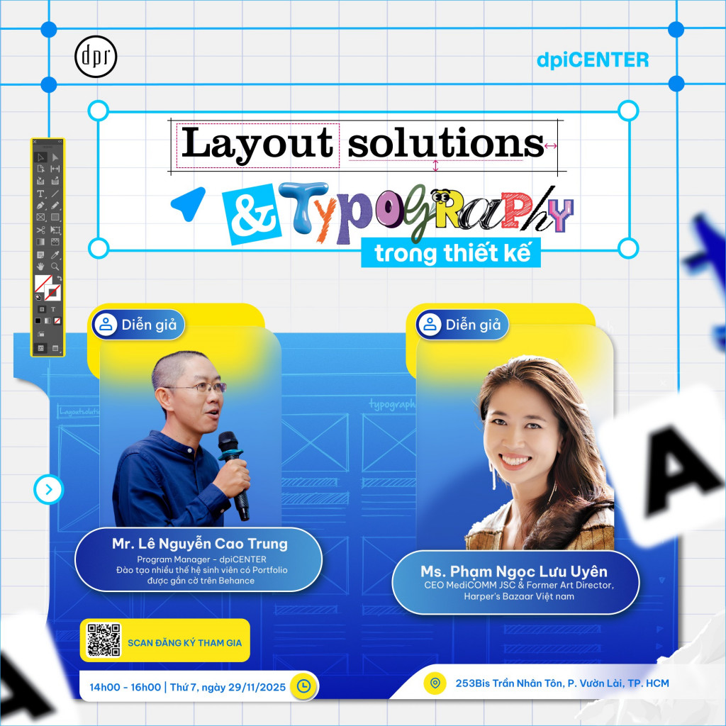 Workshop sẽ cung cấp những bí kíp thực tiễn về Typography và Layout — hai yếu tố nền tảng có vai trò quan trọng và ứng dụng rộng trong thiết kế.