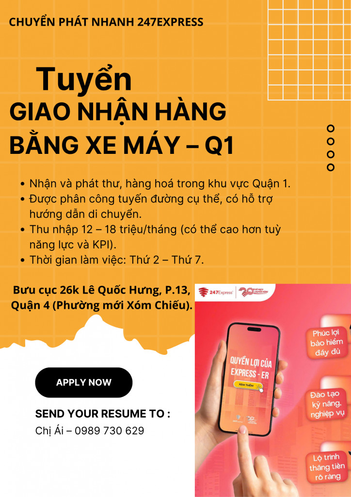 📢 CHUYỂN PHÁT NHANH 247EXPRESS TUYỂN NHÂN VIÊN GIAO NHẬN HÀNG BẰNG XE MÁY – QUẬN 1