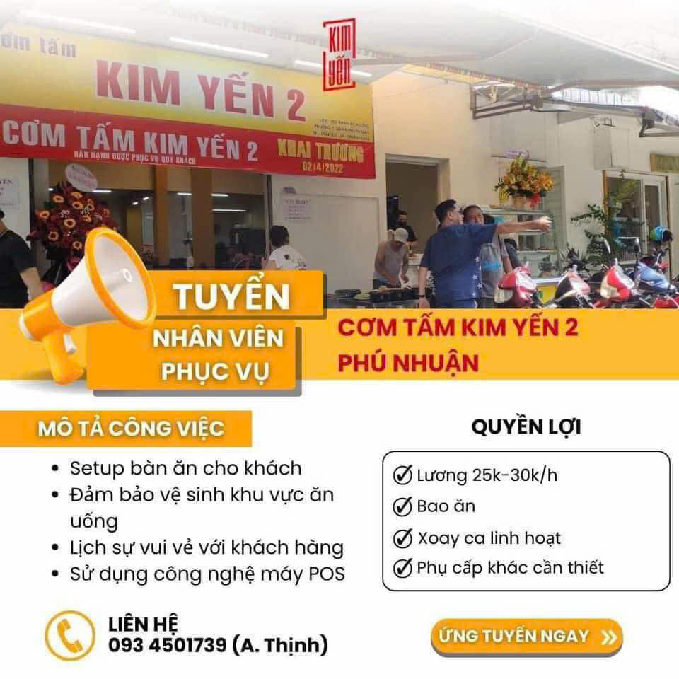 - Địa điểm làm việc: Quán cơm tấm Kim Yến 2, F002-G001 chung cư A4 Phan Xích Long, P. Cầu Kiệu, Q. Phú Nhuận