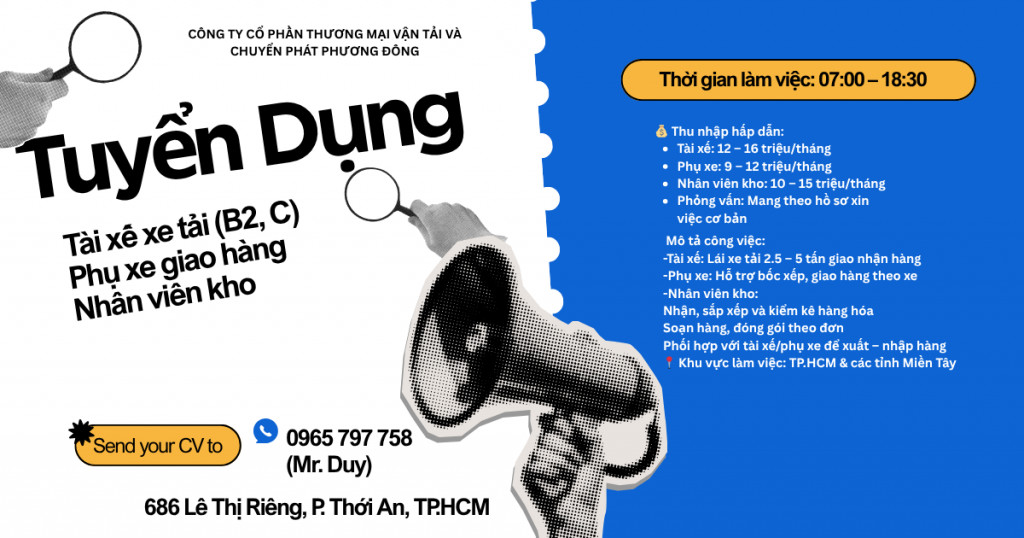🚚 CÔNG TY VẬN TẢI TUYỂN GẤP: TÀI XẾ – PHỤ XE – KHO (THU NHẬP ỔN ĐỊNH) 🚚 Lĩnh vực: Logistics – Vận tải hàng hóa