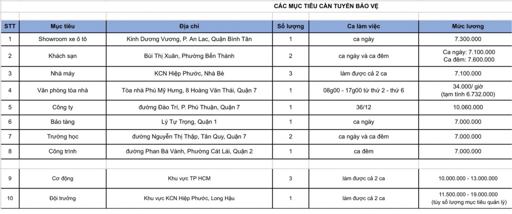 CTY BẢO VỆ THANH NIÊN Cần tuyển bảo vệ các mục tiêu sau :
