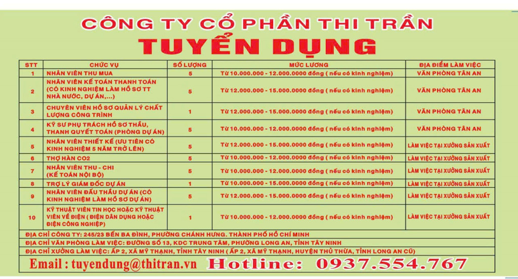 CTY THI TRẦN tuyển NV thu mua, kế toán, kỹ sư, thợ hàn & các vị trí khác