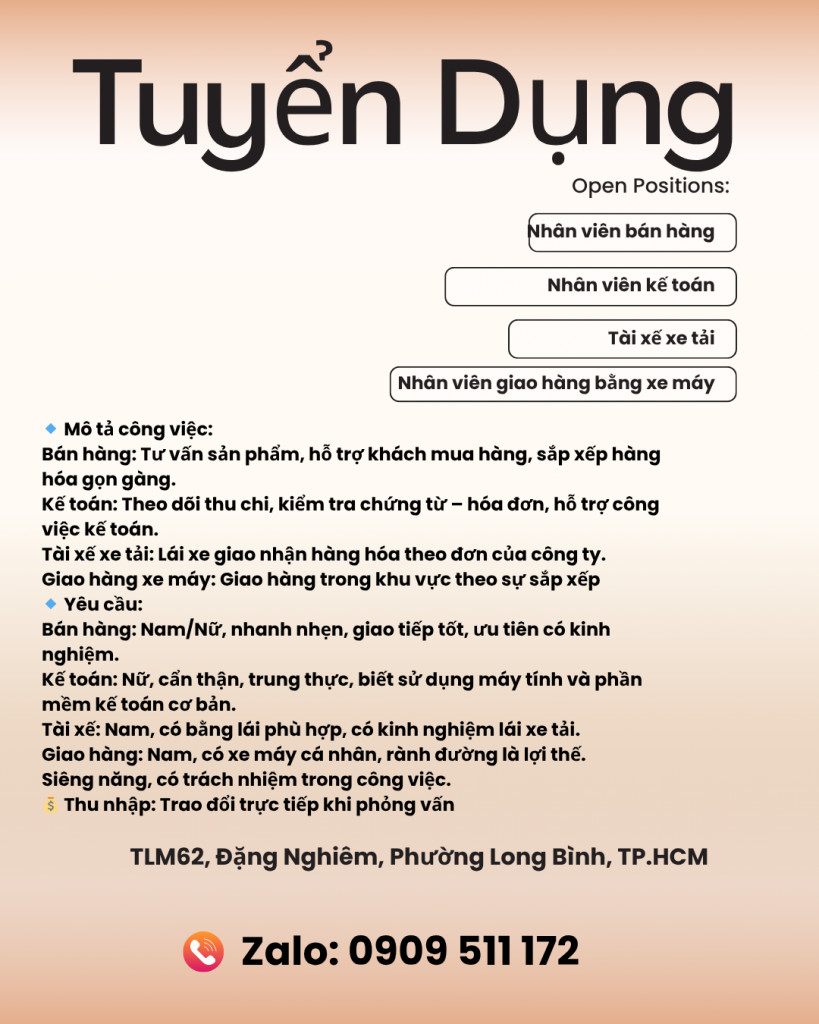 Bán hàng: Nam/Nữ, nhanh nhẹn, giao tiếp tốt, ưu tiên có kinh nghiệm.