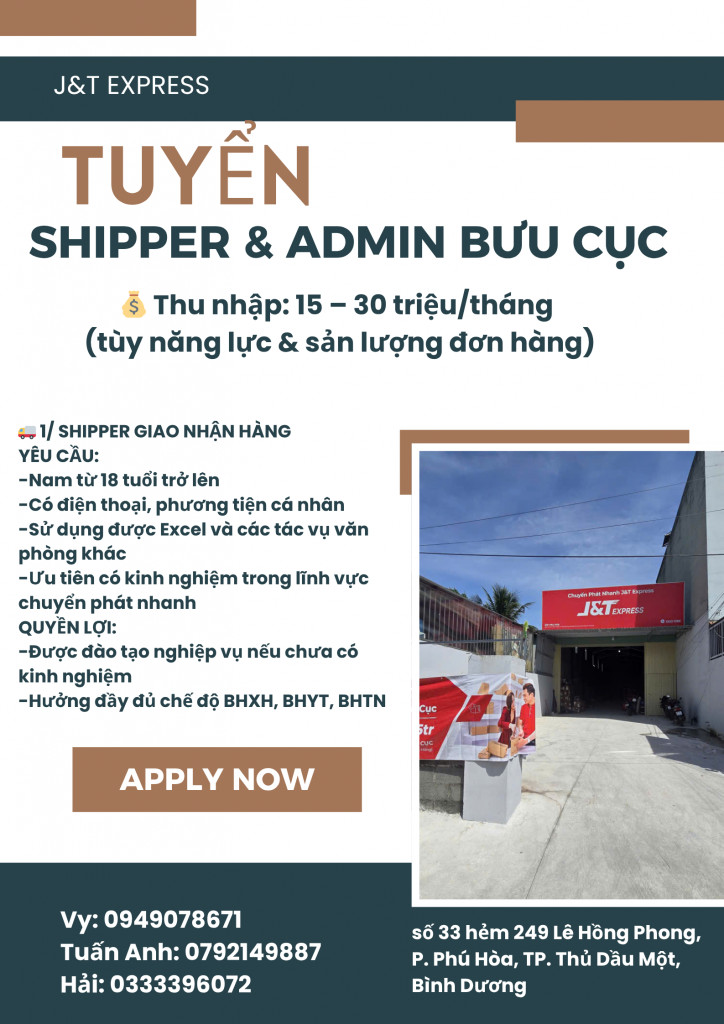 J&T EXPRESS PHÚ HOÀ TUYỂN SHIPPER GIAO NHẬN HÀNG VÀ ĐIỀU PHỐI VIÊN BƯU CỤC
