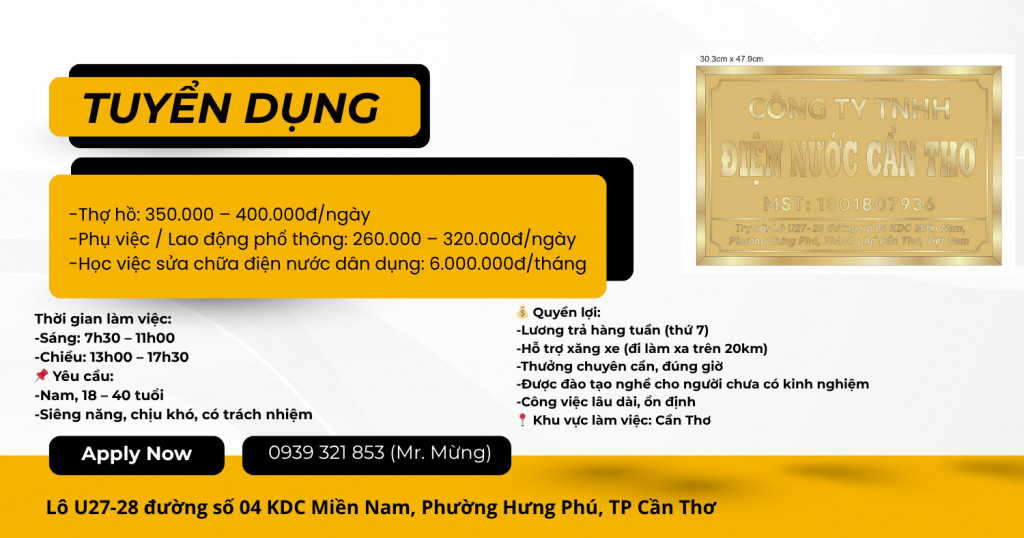 📢CÔNG TY TNHH ĐIỆN NƯỚC CẦN THƠ TUYỂN DỤNG 📢