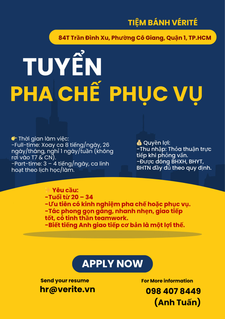 📢 TIỆM BÁNH VÉRITÉ TUYỂN DỤNG – PHA CHẾ / PHỤC VỤ 📢
