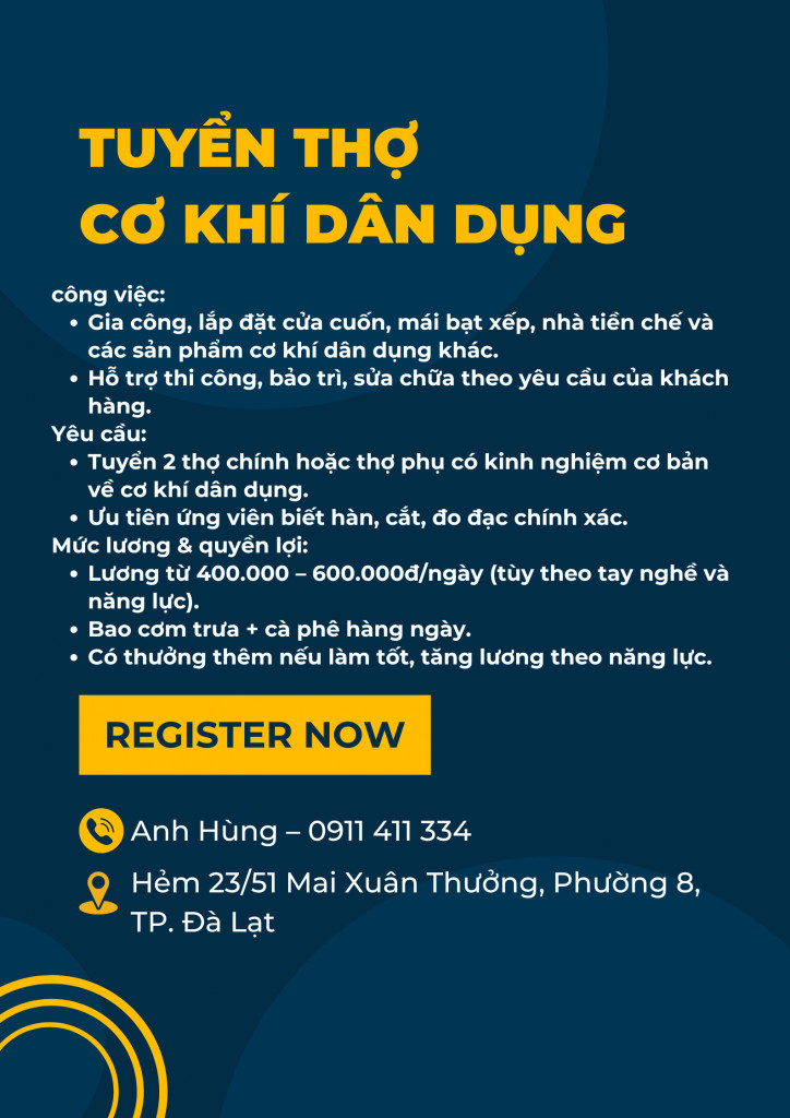 - Tuyển 2 thợ chính hoặc thợ phụ có kinh nghiệm cơ bản về cơ khí dân dụng.