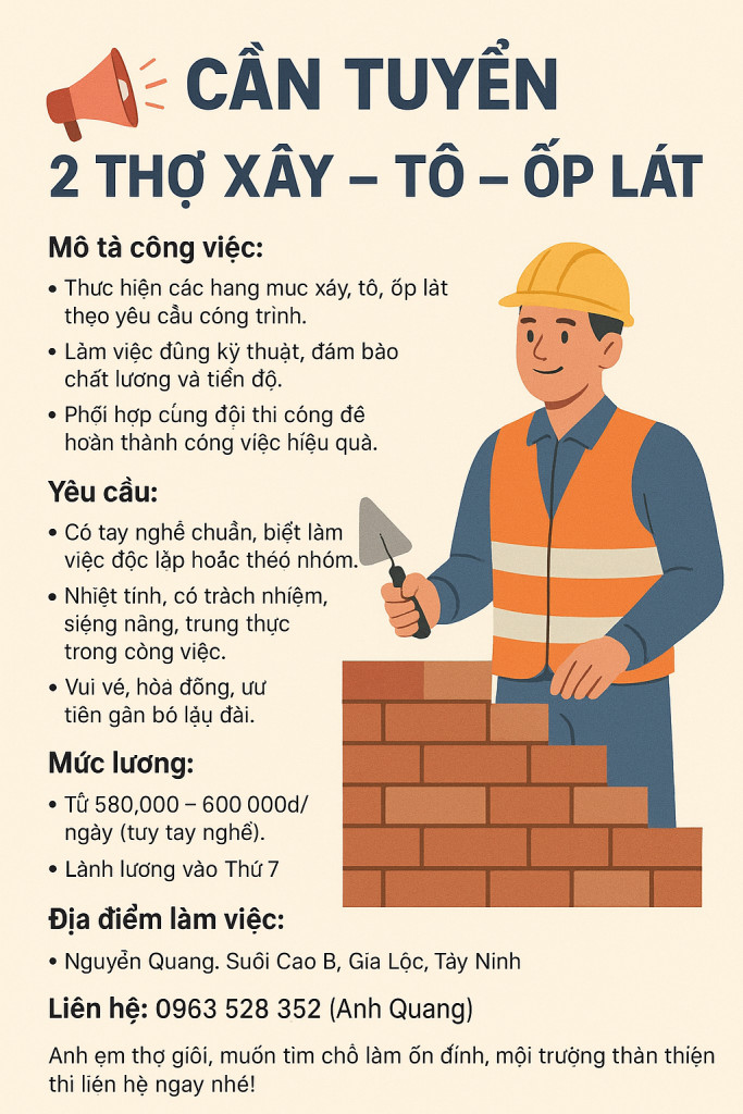 📢 CẦN TUYỂN 2 THỢ XÂY – TÔ – ỐP LÁT- Tây Ninh