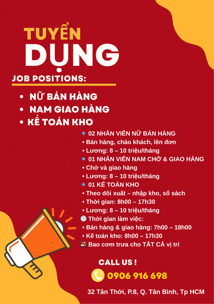 📢 TUYỂN DỤNG NHÂN VIÊN LÀM VIỆC LÂU DÀI NỮ BÁN HÀNG, NAM GIAO HÀNG, KẾ TOÁN KHO