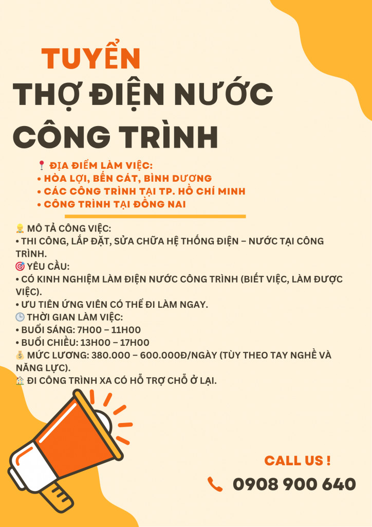 🔧 TUYỂN DỤNG THỢ ĐIỆN NƯỚC CÔNG TRÌNH 🔧