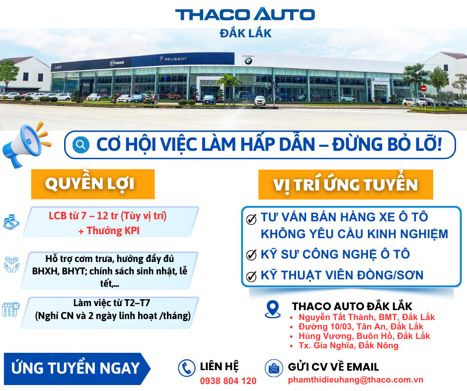 Tuyển dụng Tư vấn bán hàng xe ô tô - Showroom ô tô KIA, MAZDA, Tải bus Buôn Hồ