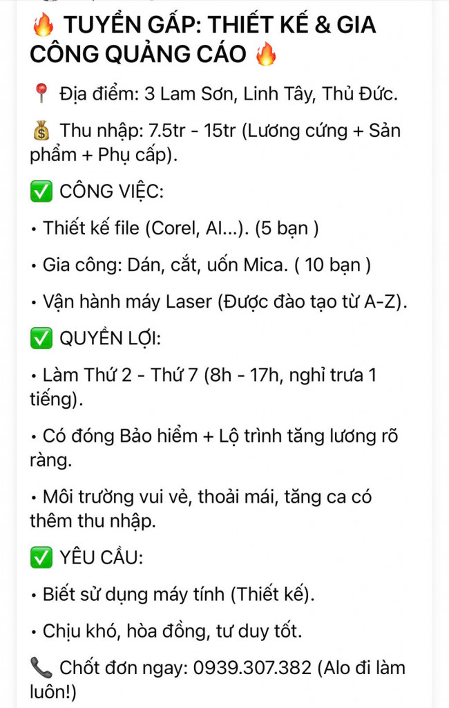 Tuyển gấp nhân viên thiết kế và gia công quảng cáo tại Thủ Đức
