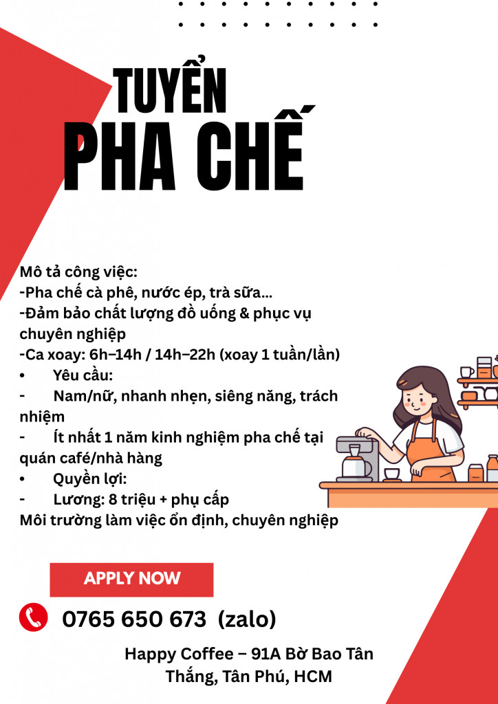 📣 TUYỂN GẤP PHA CHẾ CÓ KINH NGHIỆM - TÂN PHÚ
