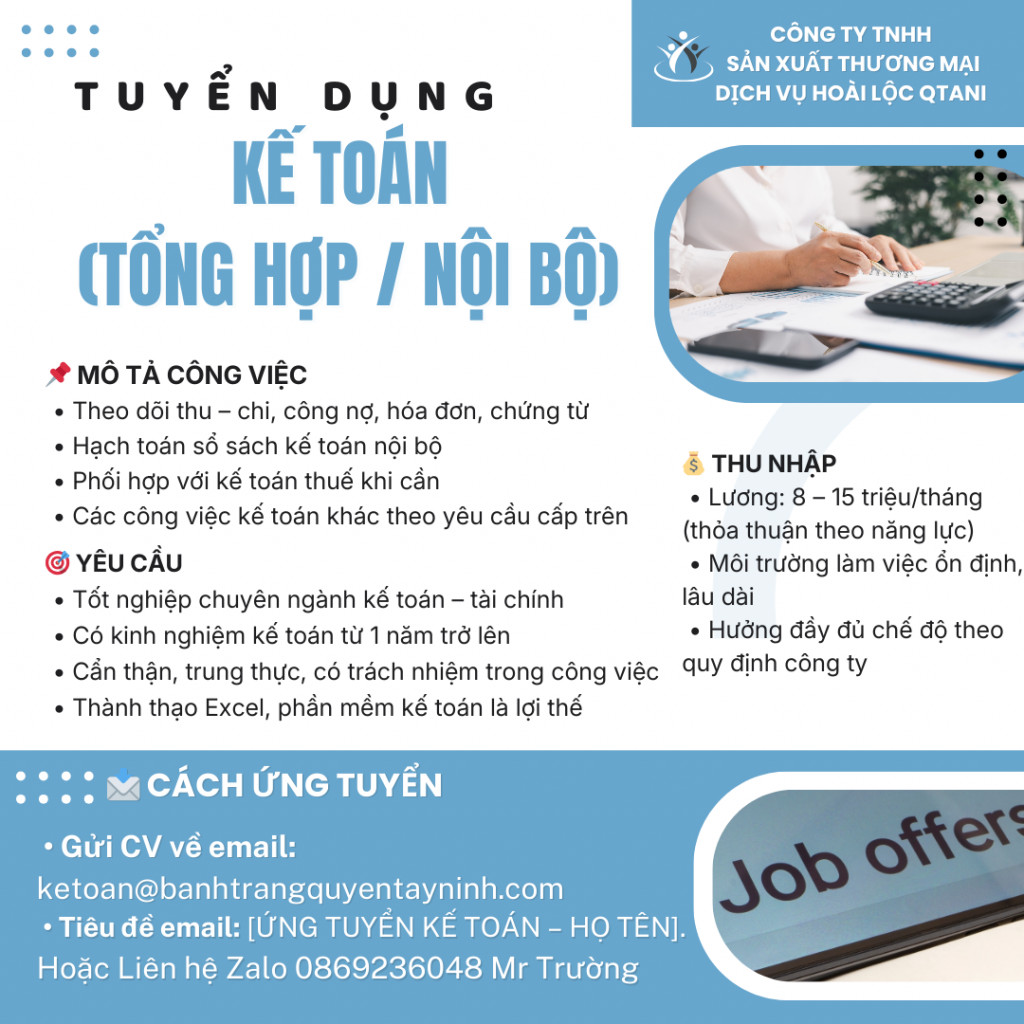 🔎 VỊ TRÍ: KẾ TOÁN (TỔNG HỢP / NỘI BỘ)