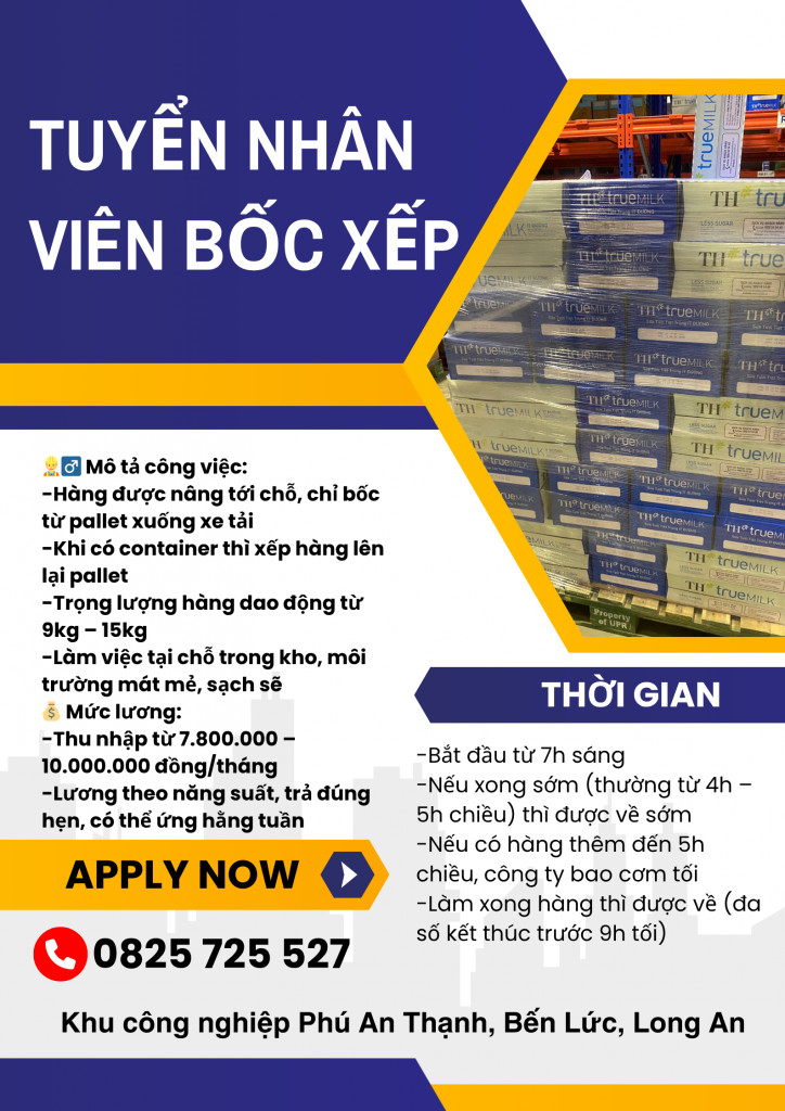 TUYỂN NHÂN VIÊN BỐC XẾP – LÀM VIỆC TẠI BẾN LỨC, LONG AN