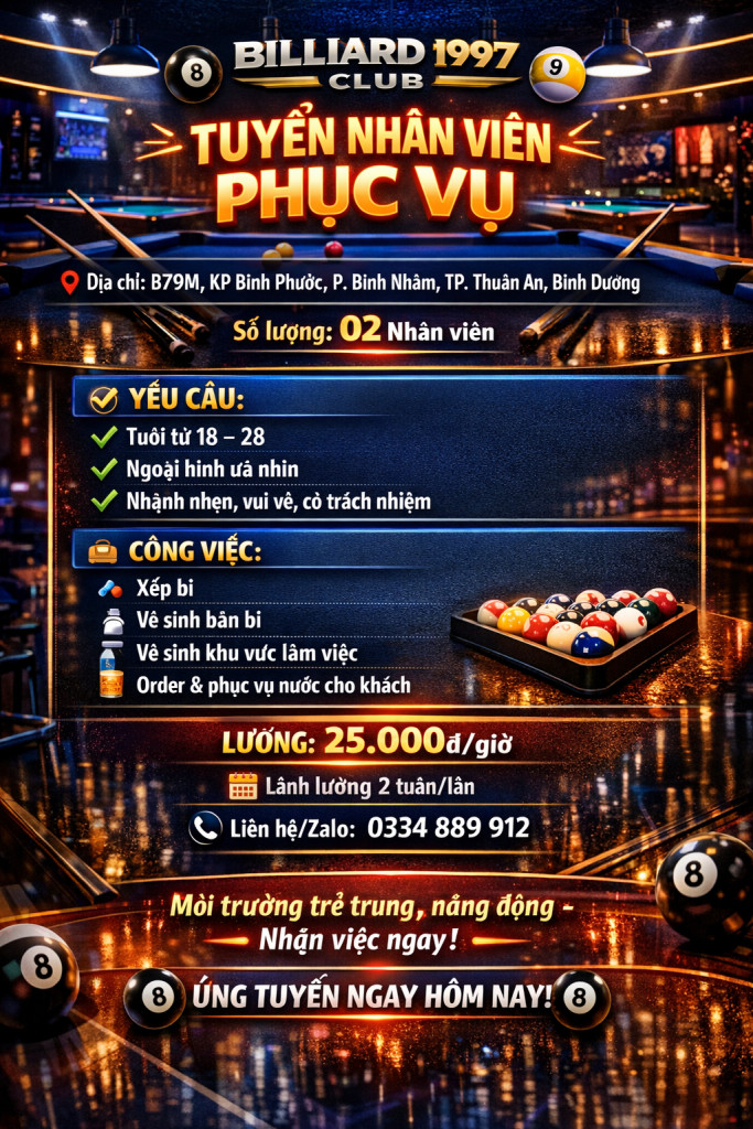 🎱 BILLIARD 1997 CLUB TUYỂN NHÂN VIÊN PHỤC VỤ 🎱