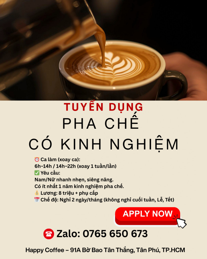 📍 Làm việc: Happy Coffee – 91A Bờ Bao Tân Thắng, Tân Phú, TP.HCM