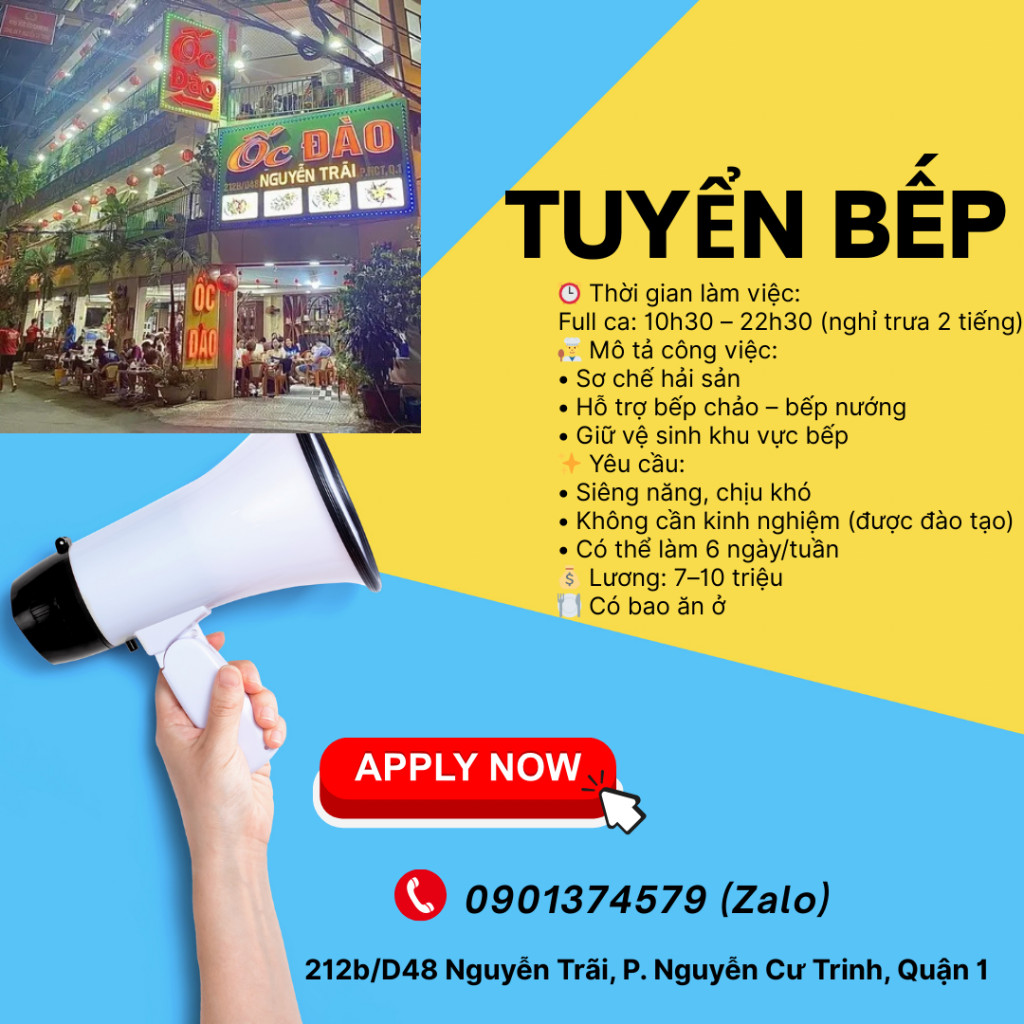 📣 TUYỂN PHỤ BẾP – ỐC ĐÀO (QUẬN 1)