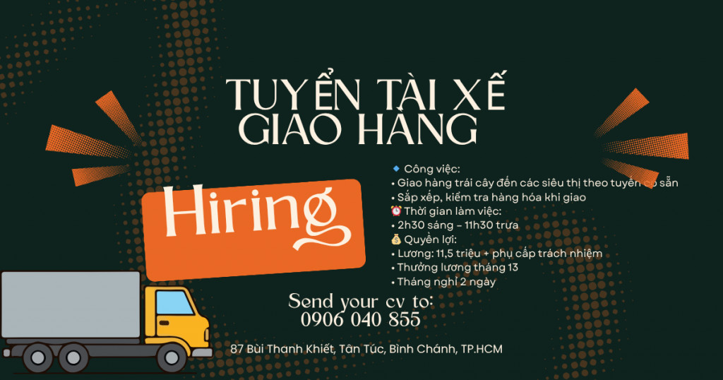 📢 Công ty Phát Hưng Thịnh cần tuyển tài xế giao hàng trái cây cho hệ thống siêu thị