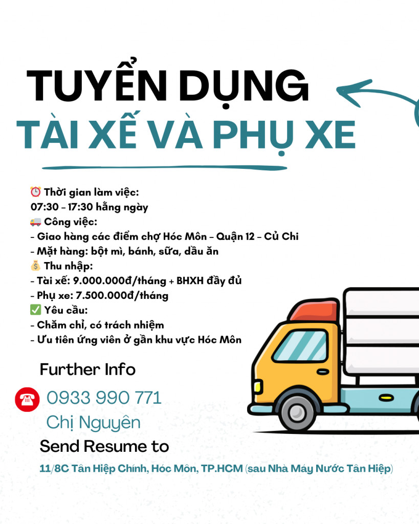 Tuyển Tài xế xe tải và phụ xe Hóc Môn