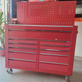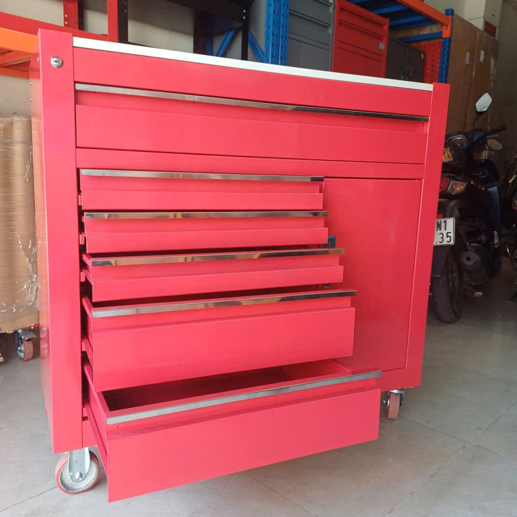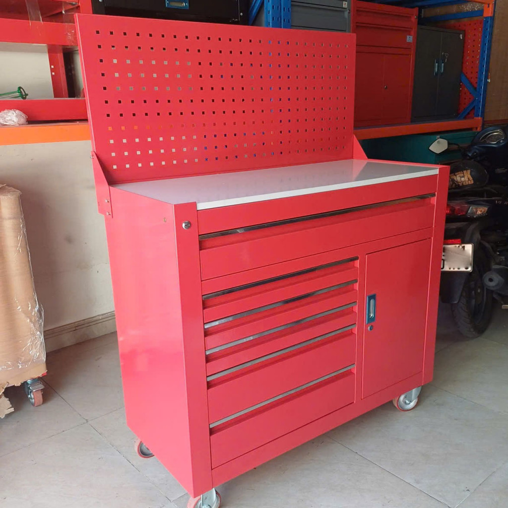 Tủ đồ nghề 6 ngăn kéo 1 cánh kết hợp bảng treo, Tủ đựng dụng cụ 7 ngăn thiết kế tiện dụng gồm 6 ngăn kéo, 1 ngăn lớn cửa 1 cánh, có bánh xe tiện di chuyển. Đây là dòng tủ đựng dụng cụ cơ khí, dụng cụ cầm tay, đồ nghề sửa chữa được sử dụng phổ biến hiện nay trong các trung tâm chăm sóc xe, garage bảo dưỡng xe, nhà máy xí nghiệp…