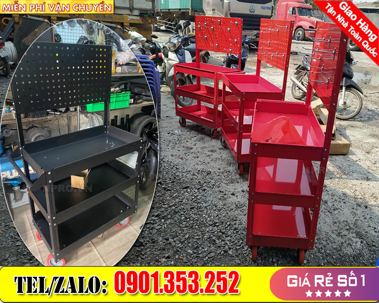 – Xe đẩy dụng cụ, xe đựng đồ nghề 3 ngăn kèm giá treo dụng cụ