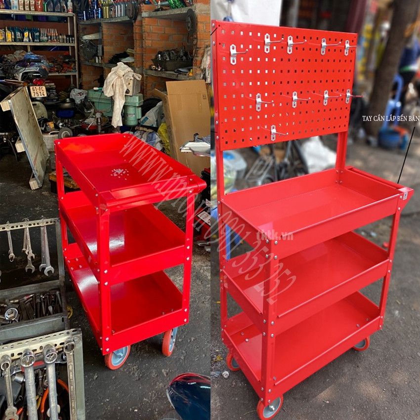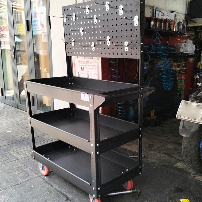· Xe đẩy 3 tầng có thể gắn thêm vách lưới của bảng treo lưới thuận tiện cho việc treo các thiết bị dụng cụ của gara như kìm búa, mỏ lếch, thước