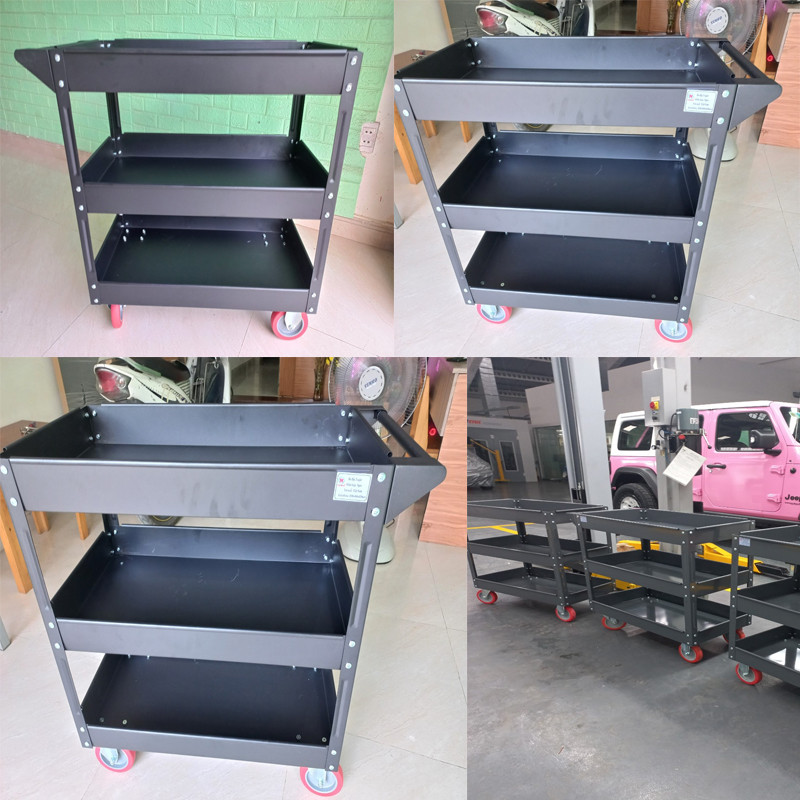 Xe đẩy 3 ngăn sơn tĩnh điện, có bánh xe tiện di chuyển. Đây là loại xe đẩy dụng cụ tiện dụng dùng để đựng dụng cụ cơ khí, đồ nghề sửa chữa trong cửa hàng sửa chữa xe máy, gara ô tô, head và giả head Honda, Yammaha, Piaggio hoặc xưởng gia công cơ khí, xí nghiệp…